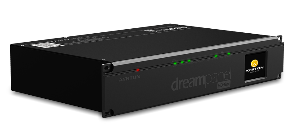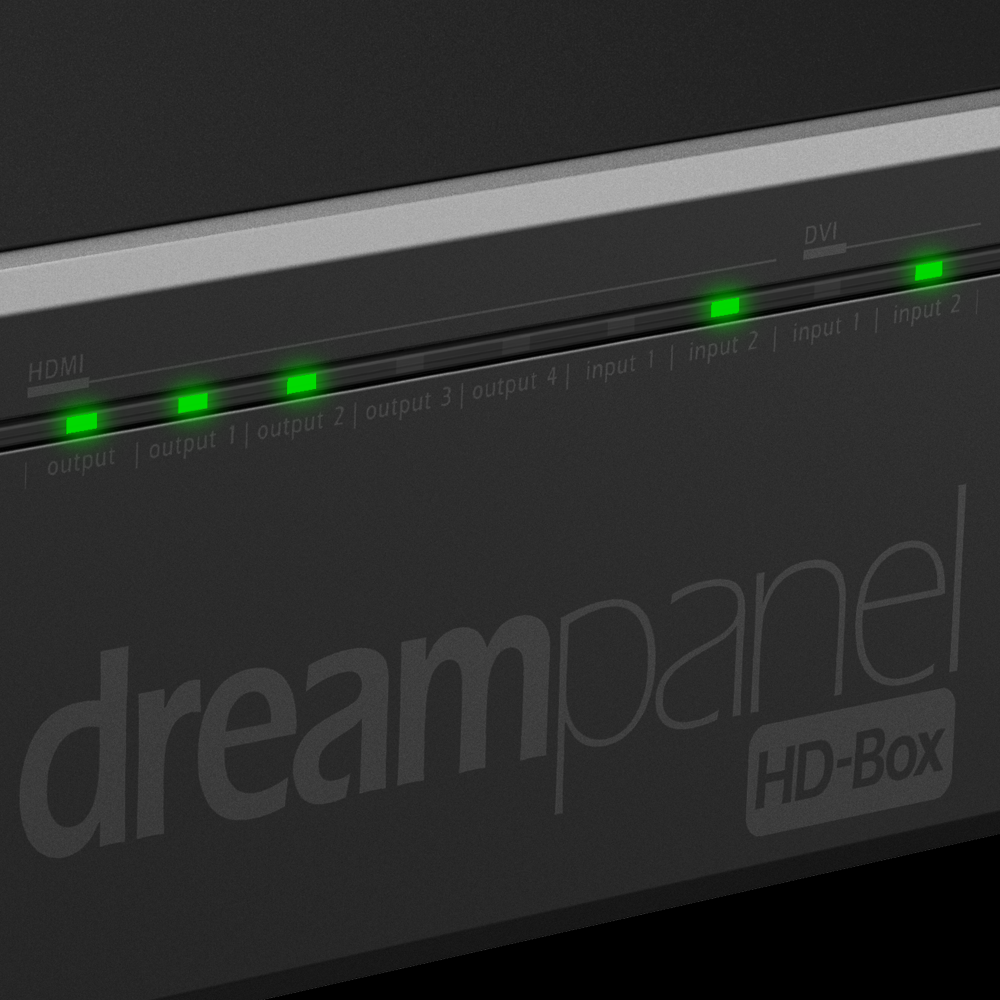 The DREAMPANEL™HD-BOX is at the heart of the system for the IMAGING DISPLAY line. It controls the entire DREAMPANEL™ family of products. The DREAMPANEL™HD-BOX receives the video signal, manages the entire system, and enables pixel-precise positioning of the tiles on a 1920 x 1080 pixel screen with real-time updating.