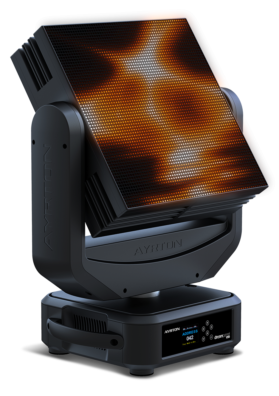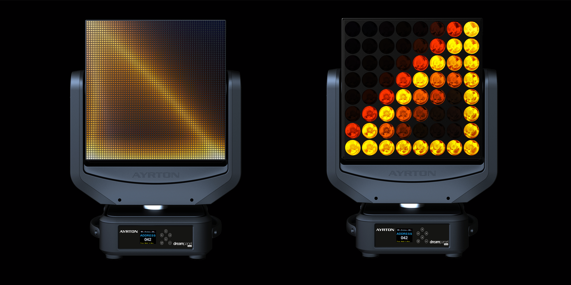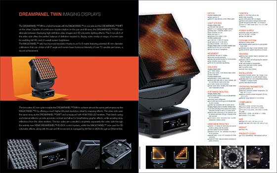 The DREAMPANEL™TWIN is a hybrid luminaire with the MAGICPANEL™ on one side and the DREAMPANEL™SHIFT on the other. Capable of continuous double rotation on the pan and tilt axes, the DREAMPANEL™TWIN can alternate between displaying high-definition video images and 3D volumetric lighting effects. The 6 mm pitch of the video side offers the perfect balance of definition required to display video media on stage, of screen size for enabling full HD, and of overall system brightness.